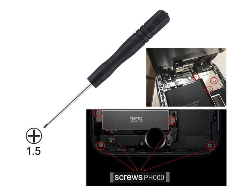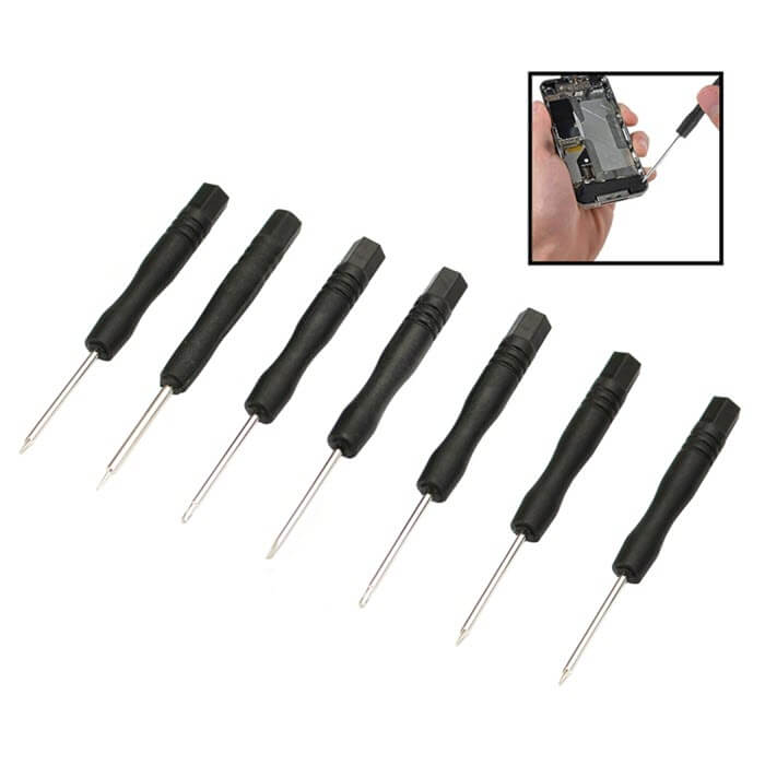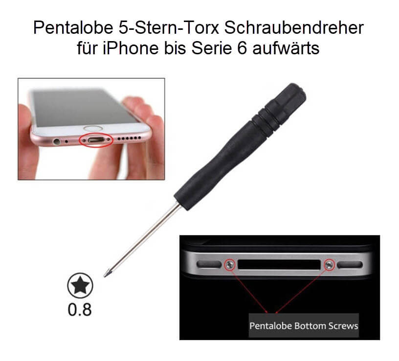 Apple hatte mit den iPhones der Serie 4 begonnen 5-Stern Schrauben zu verwenden welche mit dem Pentalobe Schraubendreher geöffnet werden. Auch in den iPhones ab Serie 7 werden weiterhin noch Pentalobe Schrauben verbaut.Standard Schraubenzieher - kreuz und flach
